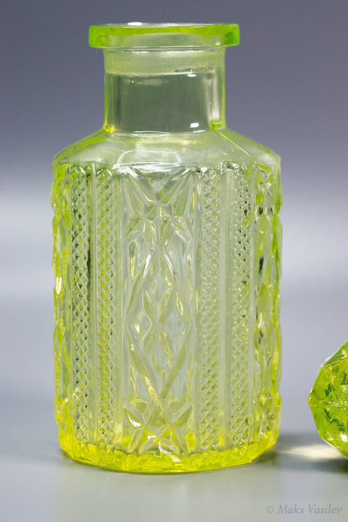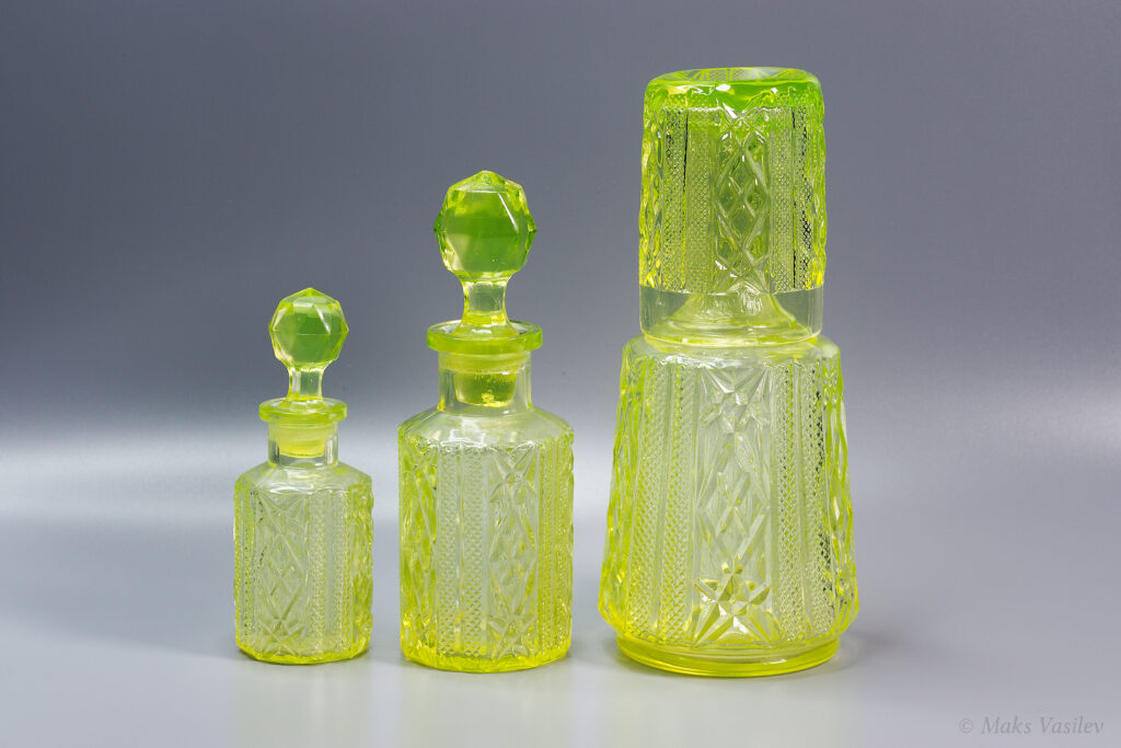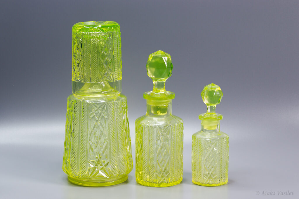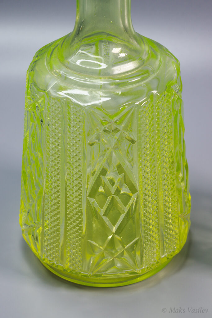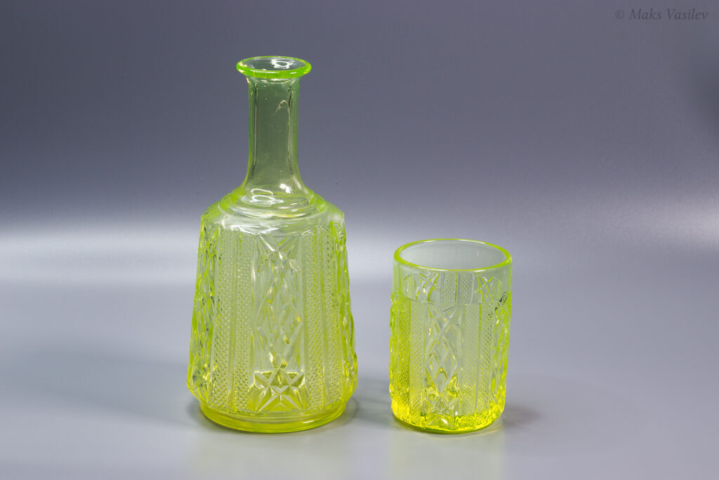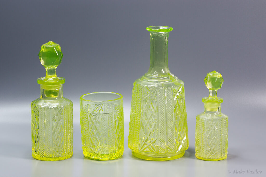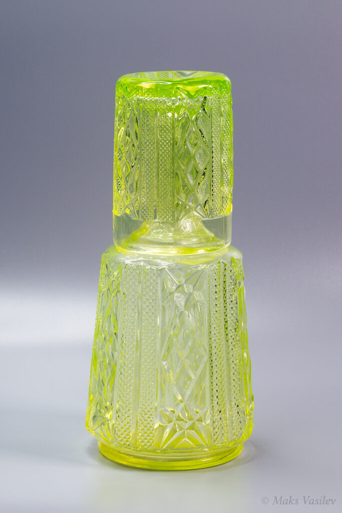 Паттерн на графине и на стакане так же, как и на большом флаконе () повторяется 5 раз и хоть на графине швы тщательно зашлифованы, их всё таки можно увидеть и судя по швам пресс форма состояла так же из 3-х не одинаковых и не симметричных частей.