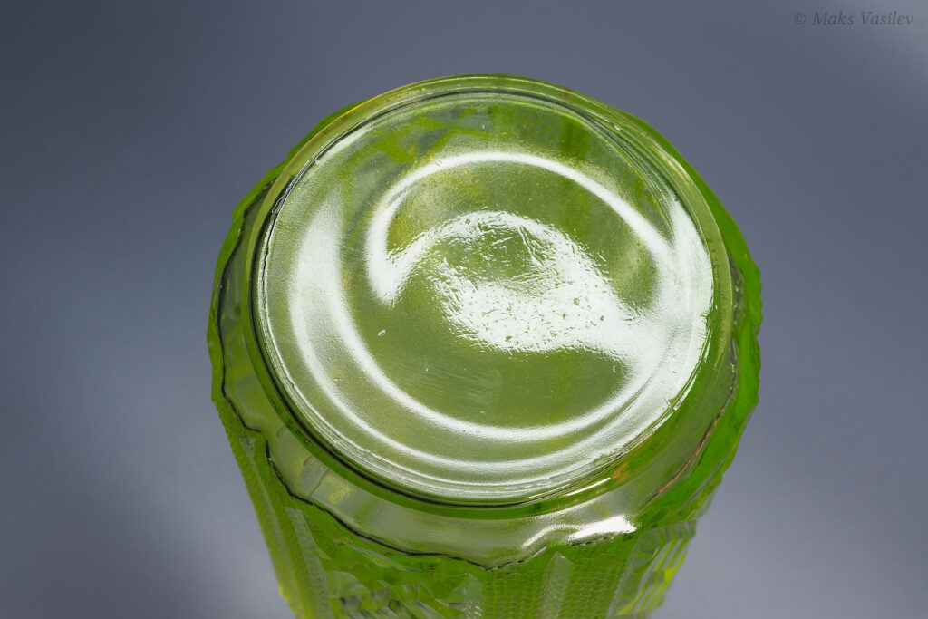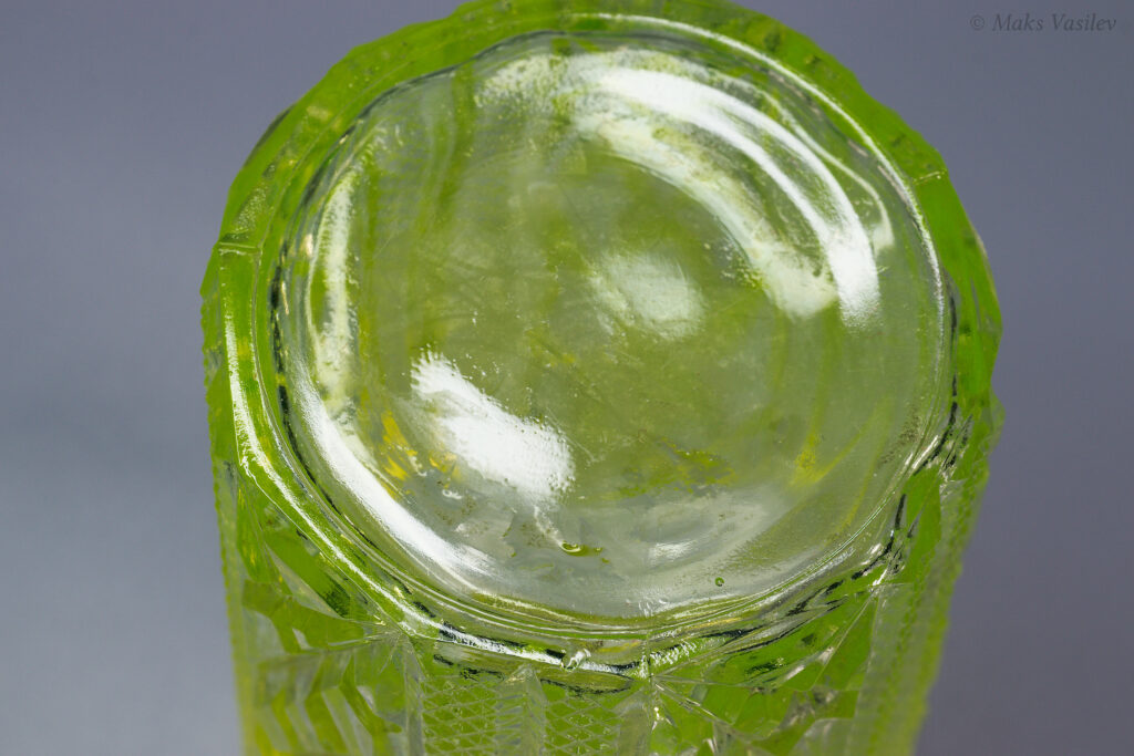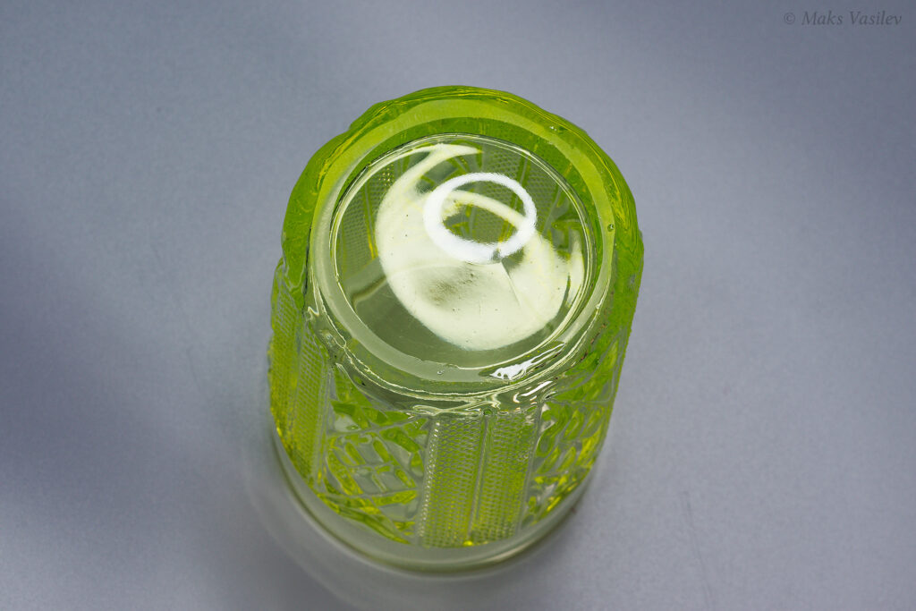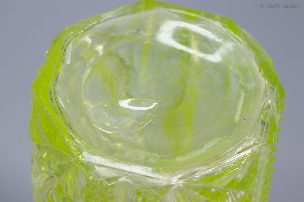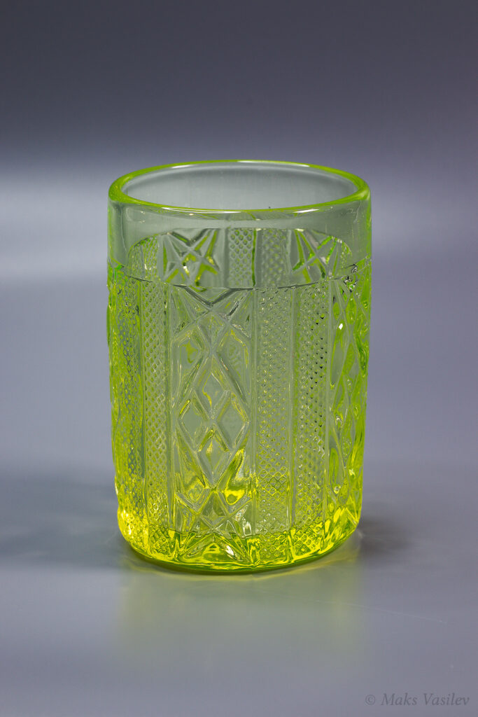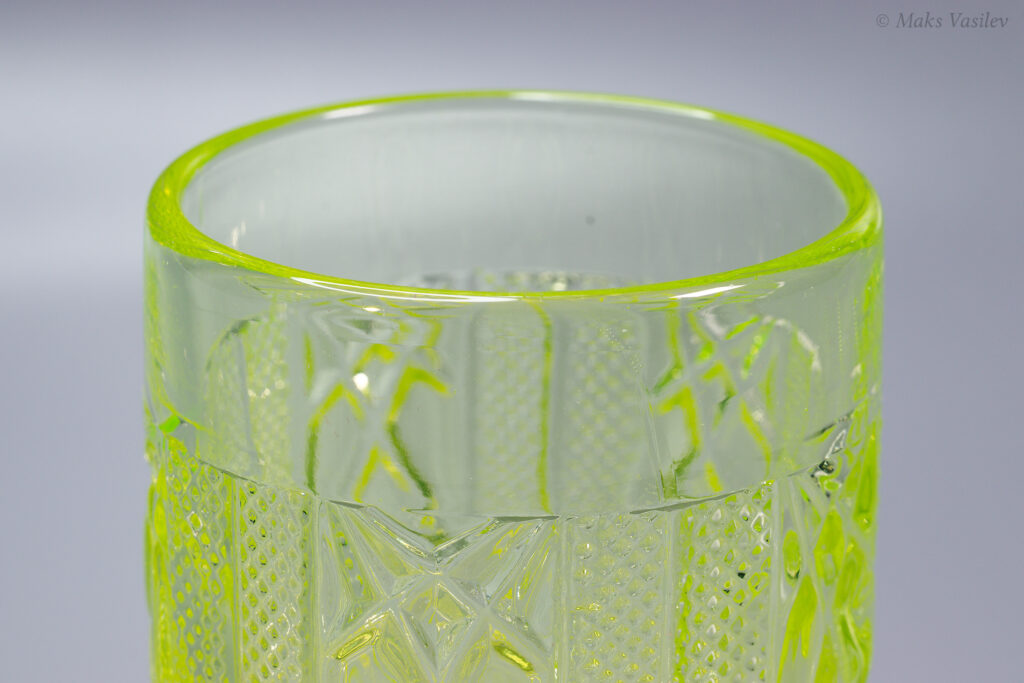 Шлифовка верхней части стакана почти идеальная, только один шов немного просматривается. Паттерн так же повторяется 5 раз. Часть паттерна стакана, которая представляет из себя мелкую насечку (точки) выполнена более мелко и имеет большую плотность этих точек, чем у графина и флаконов.