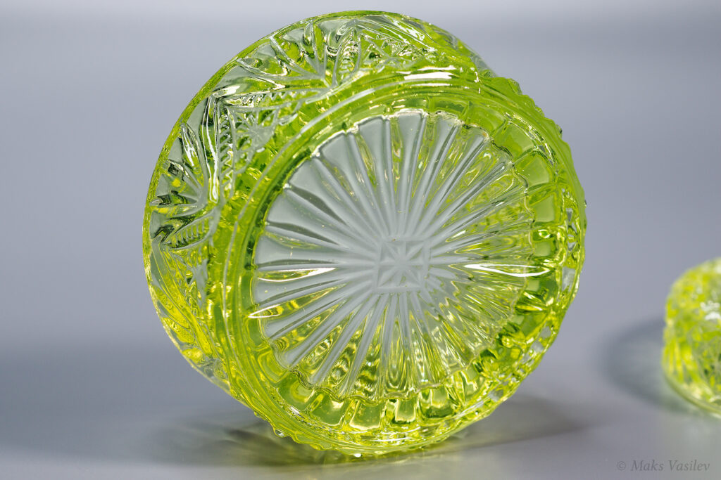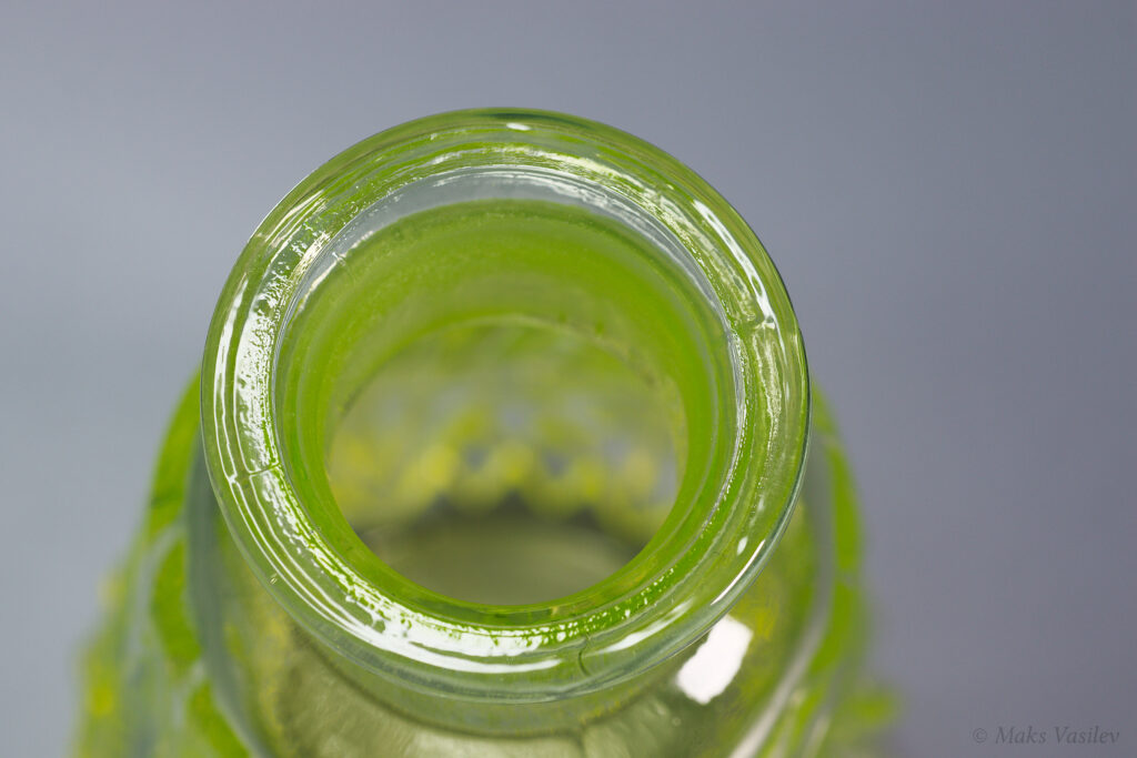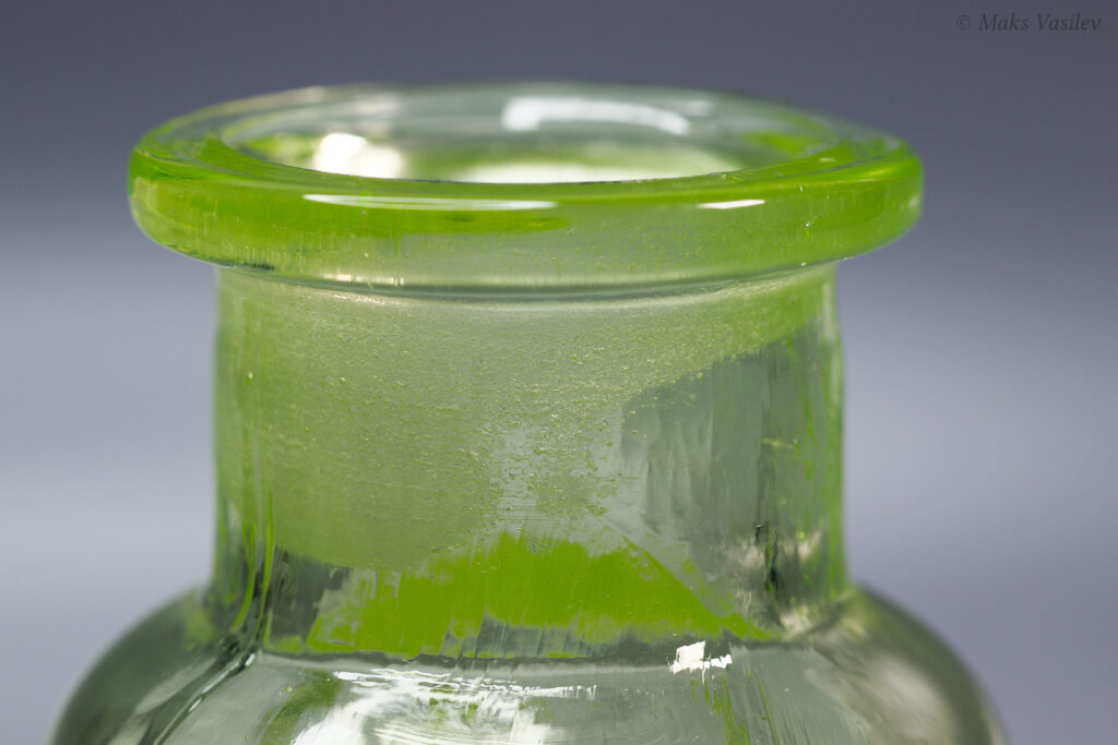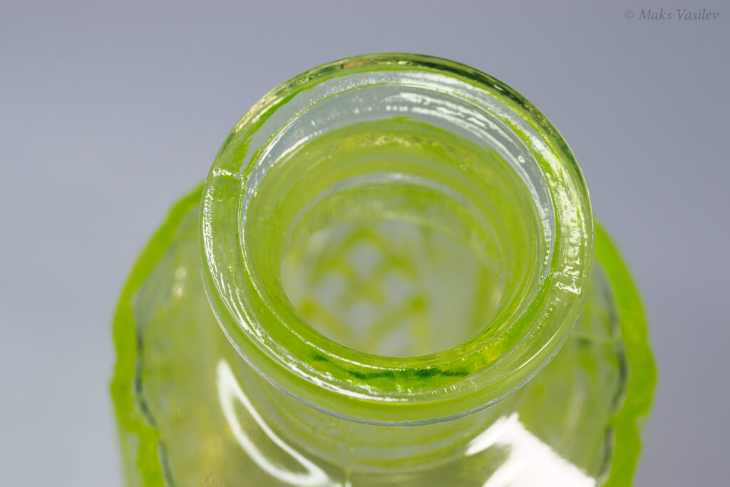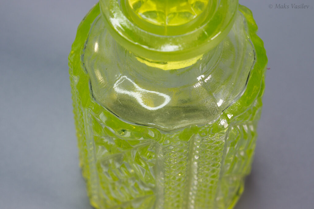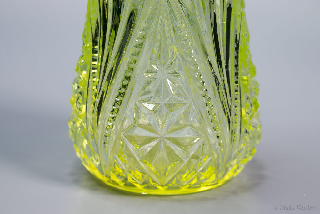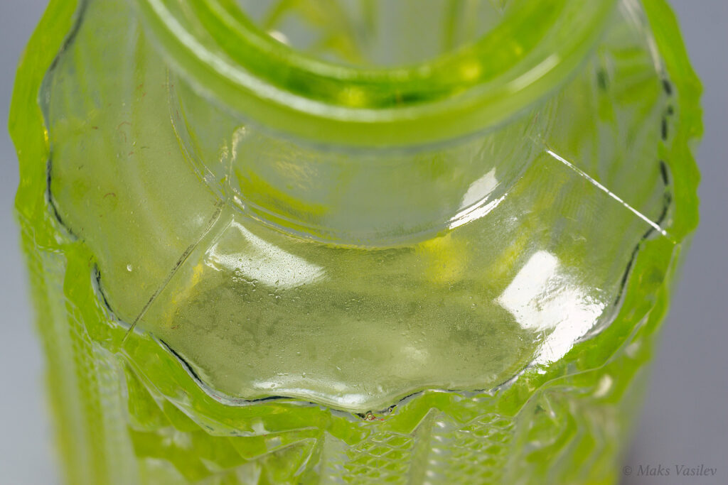 Шлифовка верхней части стакана почти идеальная, только один шов немного просматривается. Паттерн так же повторяется 5 раз. Часть паттерна стакана, которая представляет из себя мелкую насечку (точки) выполнена более мелко и имеет большую плотность этих точек, чем у графина и флаконов.