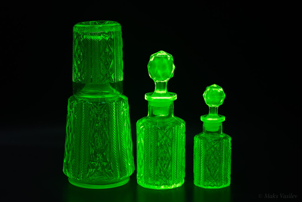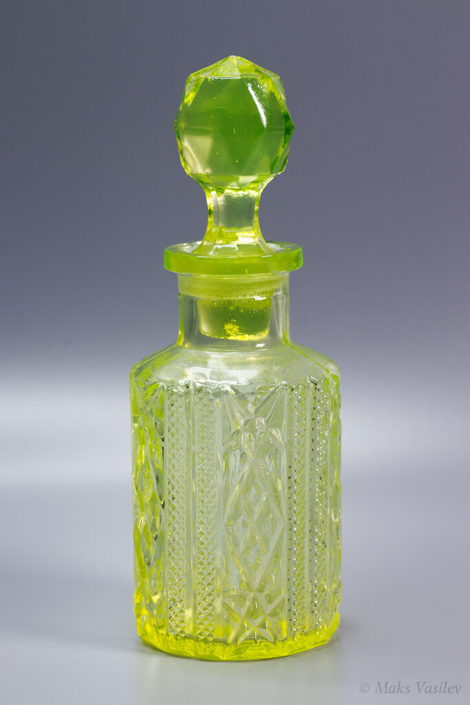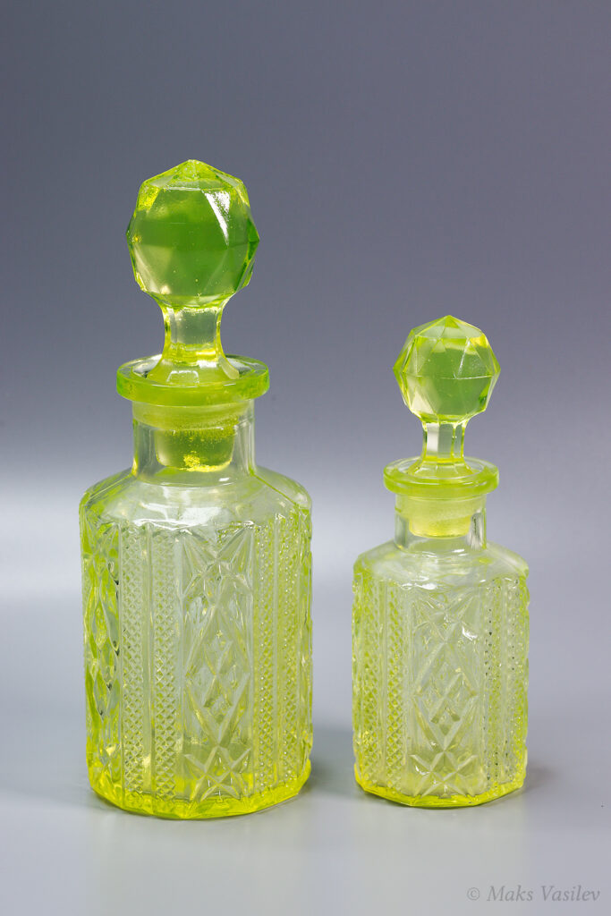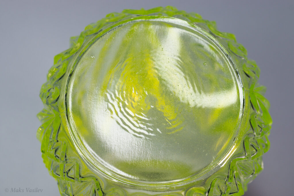 Дно у графина плоское, незначительно вогнутое внутрь и так же как и у флаконов не имеет следов специальной шлифовки. У стакана дно — чистая ровная вогнутая линза и есть широкая полоса от заводской шлифовки. В этом плане стакан немного выделяется из всех изделий Brockwitz. Более того по цвету — стакан самый насыщенный. Возможно он из более поздних партий чем графин и флаконы.