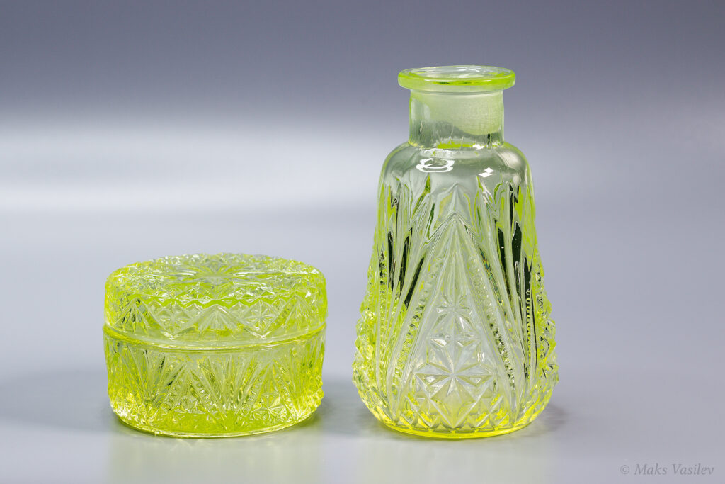 Предметы из туалетного гарнитура, флакон и шкатулка для зубного порошка.