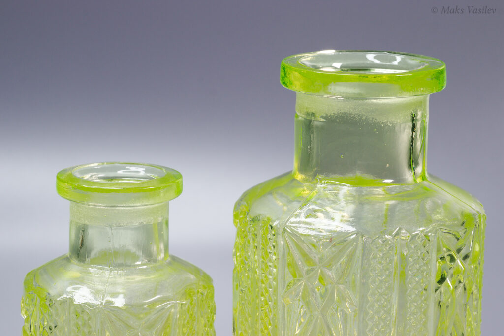 Вершина горловины обоих флаконов имеет меньший диаметр, чем та часть горловины, которая прессовалась как часть тулова, из-за этого притирка у обоих флаконов под пробку имеет форму кольца только в верхней части. Пробки обоих флаконов притёрты весьма условно.