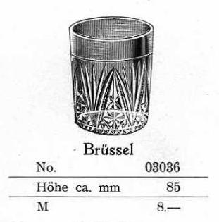 Сам по себе дизайн паттерна очень красив и даже необычен для германского стекла начала 20 века, больше напоминает рисунки французского стекла более ранней эпохи, и хорошо запоминается, стоит лишь один раз его увидеть. В каталогах Brockwitz на странице с именно с этим гарнитуром нет никаких упоминаний о названии паттерна, однако на первых страницах каталога, где представлены различные кружки и стаканы, большинство из них подписаны в соответствии с паттернами гарнитуров. Среди прочего встречается и подписанный стакан с паттерном «Brüssel» (Брюссель во фламандском написании) за номером №03036, что соответствует номерам прикроватного графина со стаканом из гарнитура: №03036/2 — графин со стаканом в комплекте.