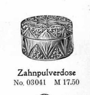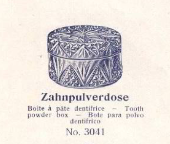 В каталоге именовалась как шкатулка для зубного порошка и была самой простой по форме из 4-х коробочек, наряду со шкатулками для помады, пудры и шкатулки для волос. Последняя имела отверстие в крышке.