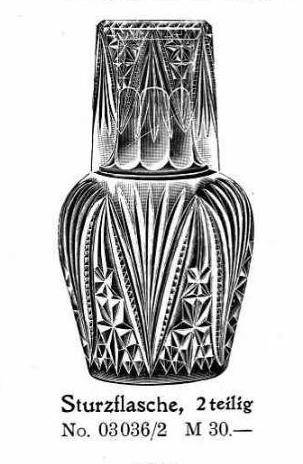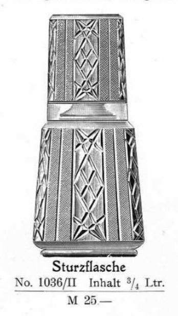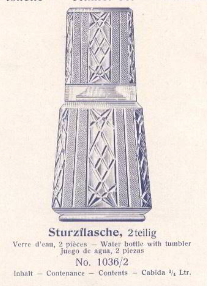 Так же как и флакон, набор из графина со стаканом присутствует в составе туалетного набора из 16-ти предметов в каталогах компании Brockwitz Glass 1915, 1921, 1926, 1931 годов. В каталоге 1915 года флакон имеет номер 1036