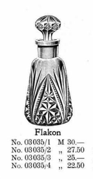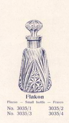 Следующий флакон имеет дизайн паттерна, который присутствует в составе туалетного набора из 16-ти предметов в каталогах компании Brockwitz Glass 1915, 1921, 1926, 1931 годов. В каталоге 1915 года флакон имеет номер 1035 и 4 размера.