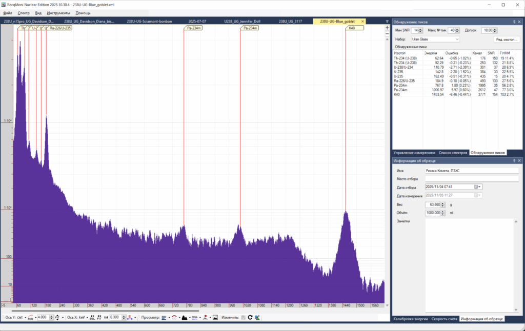 Ключевыми здесь являются обнаруженные пики цепи распада урана, а именно 63 и 92 кэВ: торий-234, первый дочерний продукт в цепи распада урана-238; Изомер проактиния-234м с пиками 760 и 1001 кэВ: второй дочерний продукт распада урана-238. А так же пики урана-235, входящего в изотопный состав природного урана с энергиями 110, 145, 163 и пик суммы радия-226 и урана-235 на 185 кэВ. Изотоп калий-40 является частью природной смеси изотопов калия и не относится к урану, калий входит в состав шихты при изготовлении стекла. Так же на спектре присутствует пик рентгеновской флюоресценции свинца, около 75 кэВ, входящего в состав стекла, а так же являющегося материалом защиты детектора спектрометрической установки.