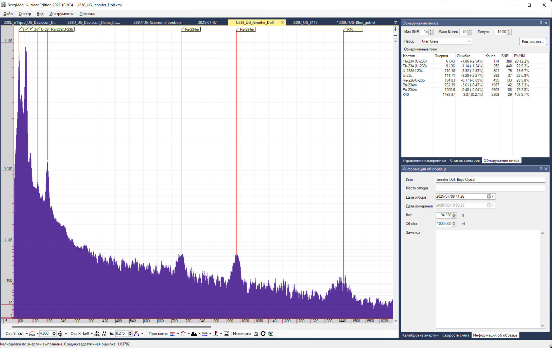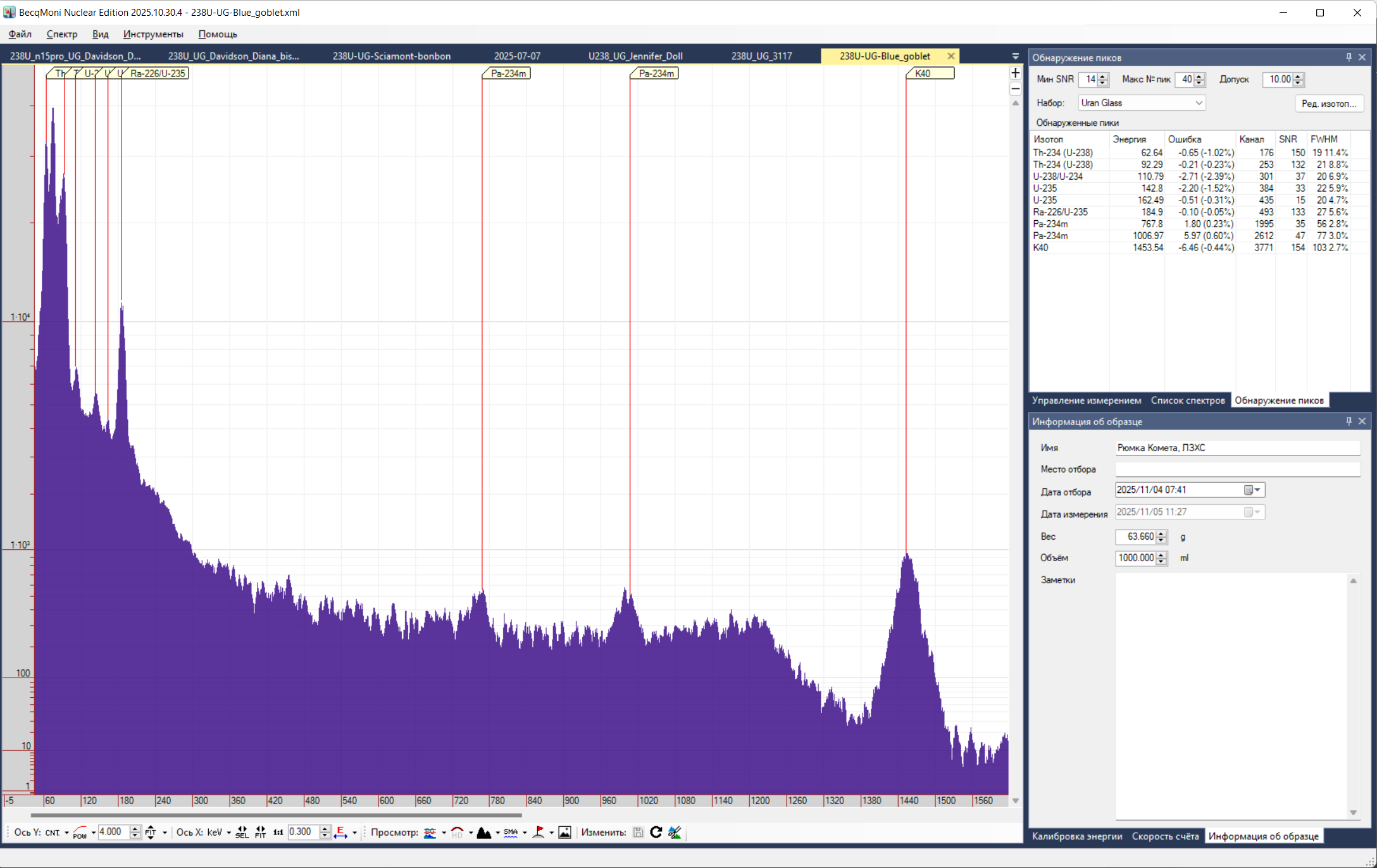 Наличие пяти пиков энергий: 63, 92, 185, 760, 1001 с высоким качеством (SNR > 20) является 100% гарантией присутствия урана в стекле.