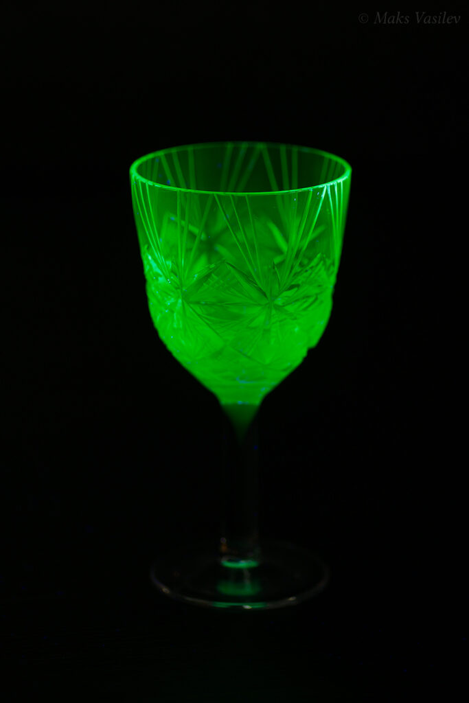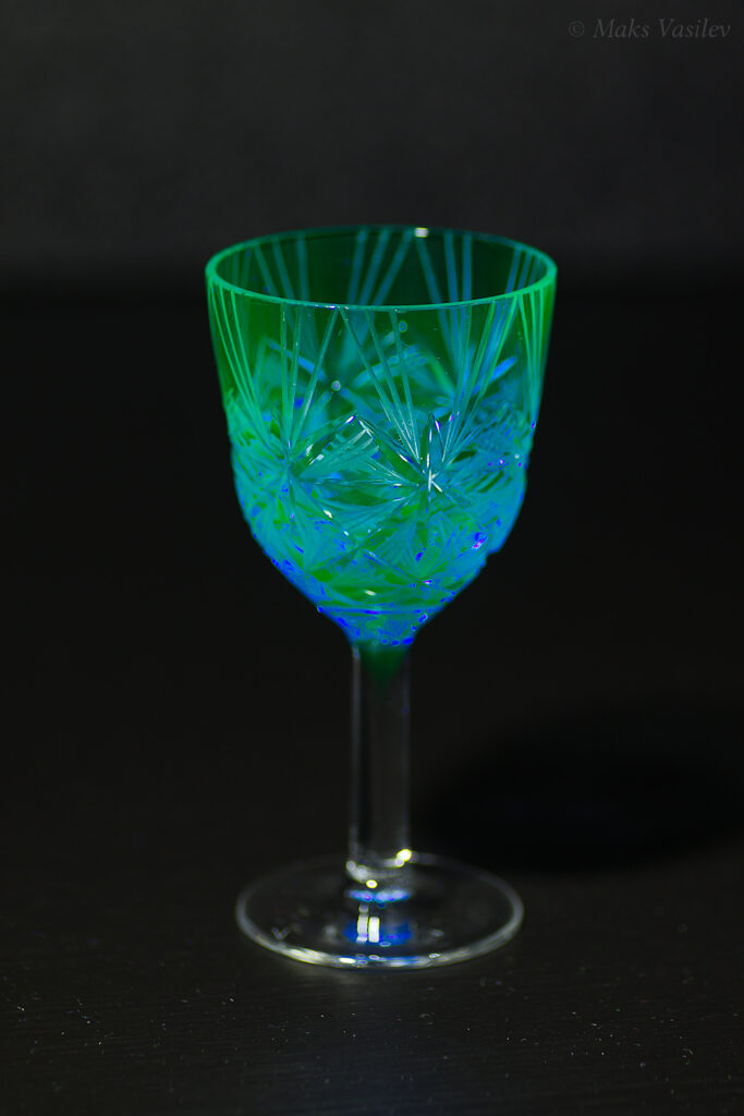 Такое необычное сочетание соединений кобальта, как красителя стекла в глубокий синий цвет и урана, дающего стеклу зелёную люминесценцию встречается крайне редко, но тем не менее такое стекло есть.