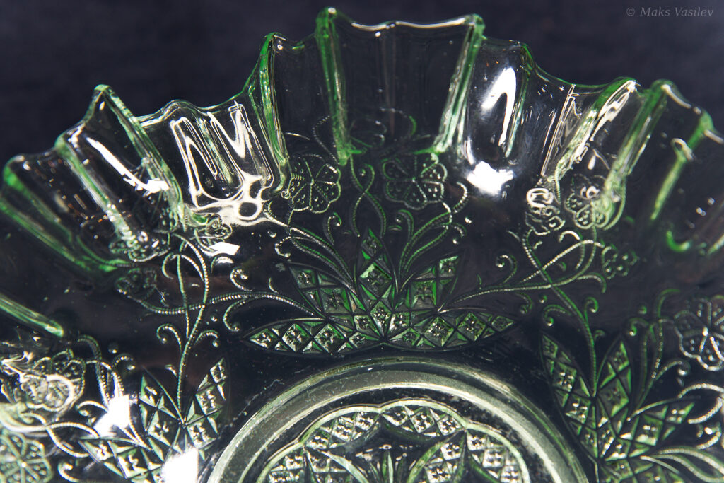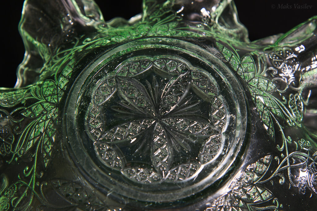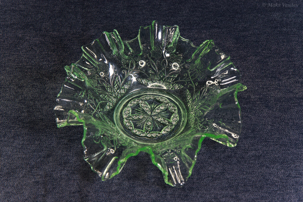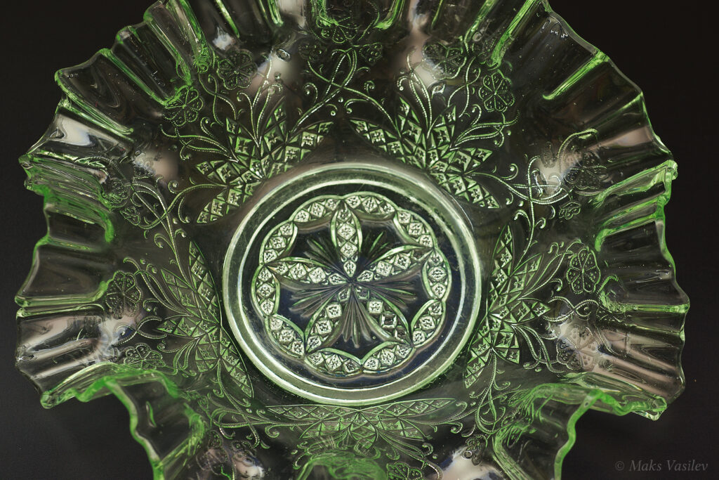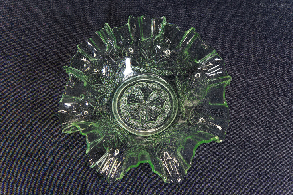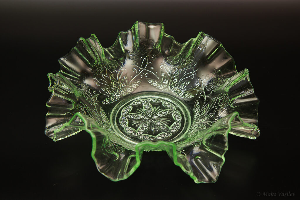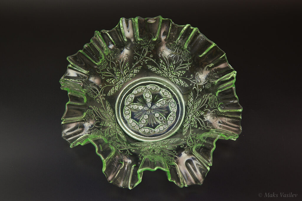 Данное блюдо периодически встречается в интернете, при чём как в урановом стекле, как в данном случае, но чаще в обычном светло-прозрачном стекле. Среди коллекционеров оно так же представлено не единичными случаями а как минимум в нескольких вариантах обычного стекла, включая прозрачное. Несмотря на это, однозначно определить производителя до сих пор невозможно, т.к. нет каталогов именно с таким рисунком. Можно лишь сделать предположения, кто из производителей мог оказаться ближе всего. Прежде всего именно в такой технике и в подобном стиле часто встречаются каталожные изделия компании Radeberg. Так же подобные вещи встречаются у компании Brockwitz Glass. Оба этих германских производителя вполне могли сотрудничать, и в целом можно сказать, что наиболее близкие родственные связи у представленного выше блюда именно с Германией.