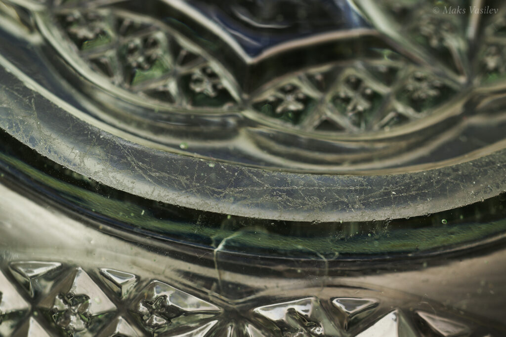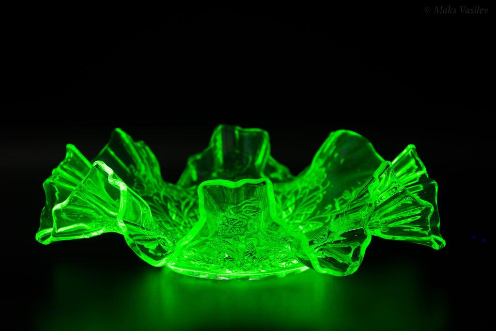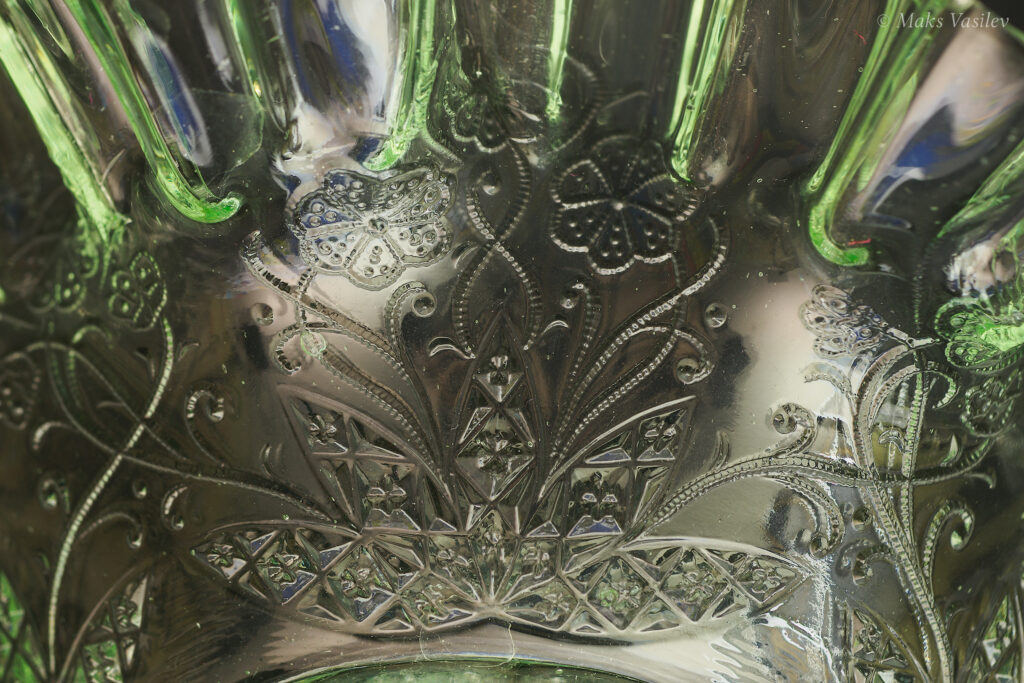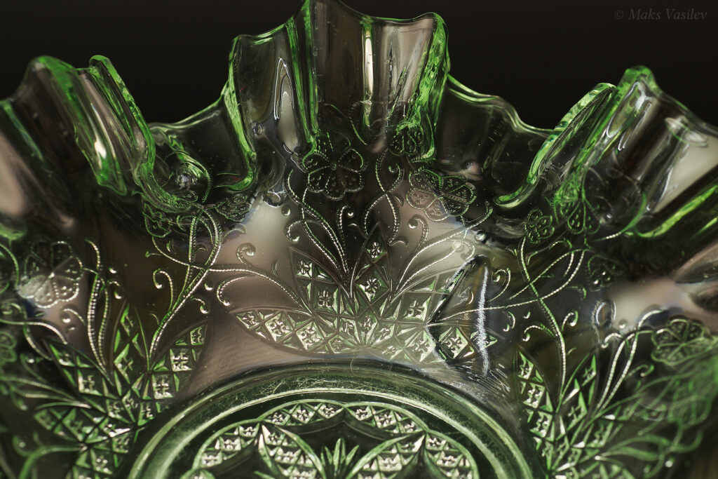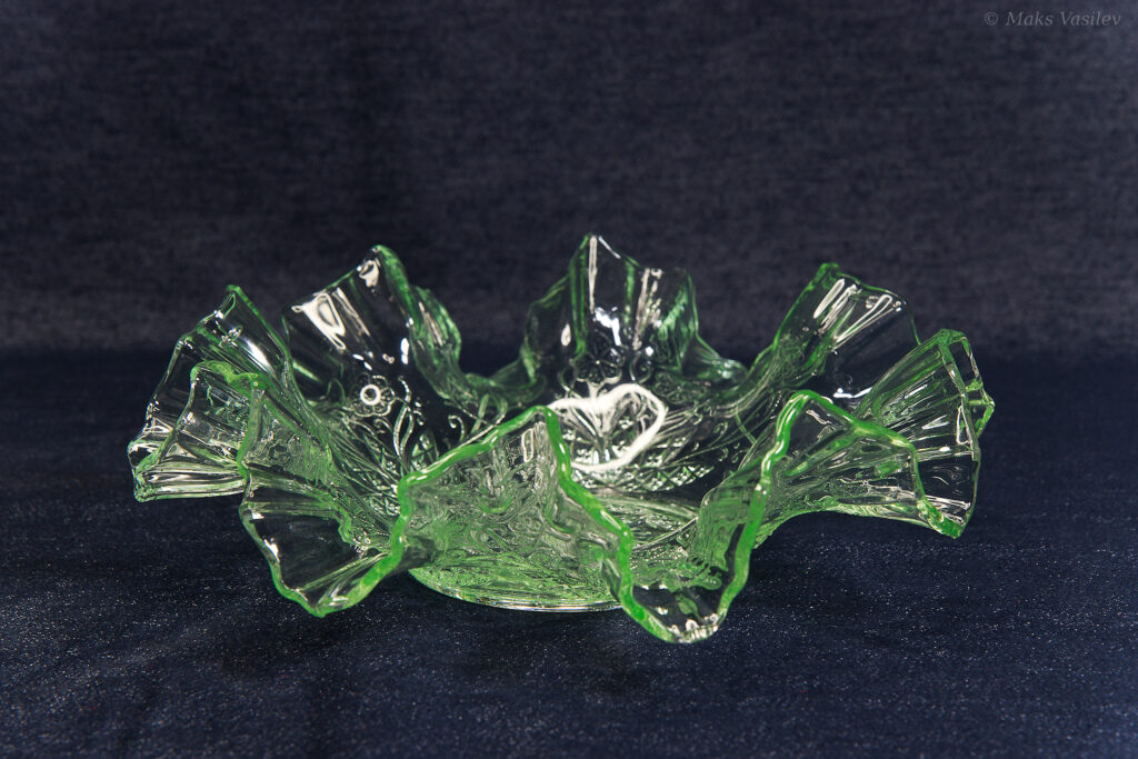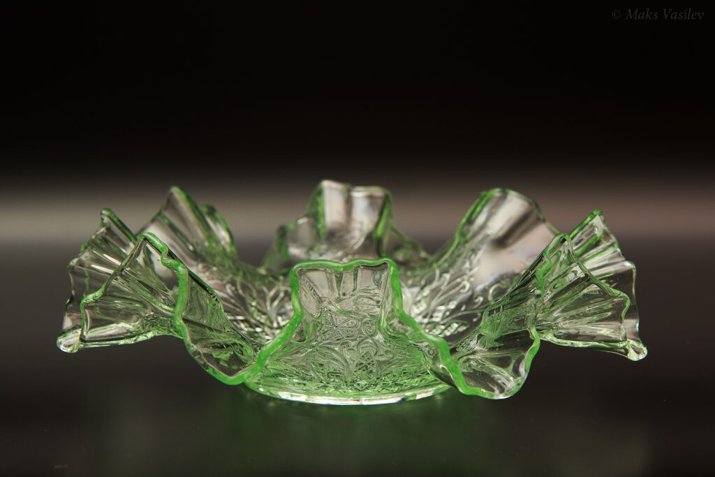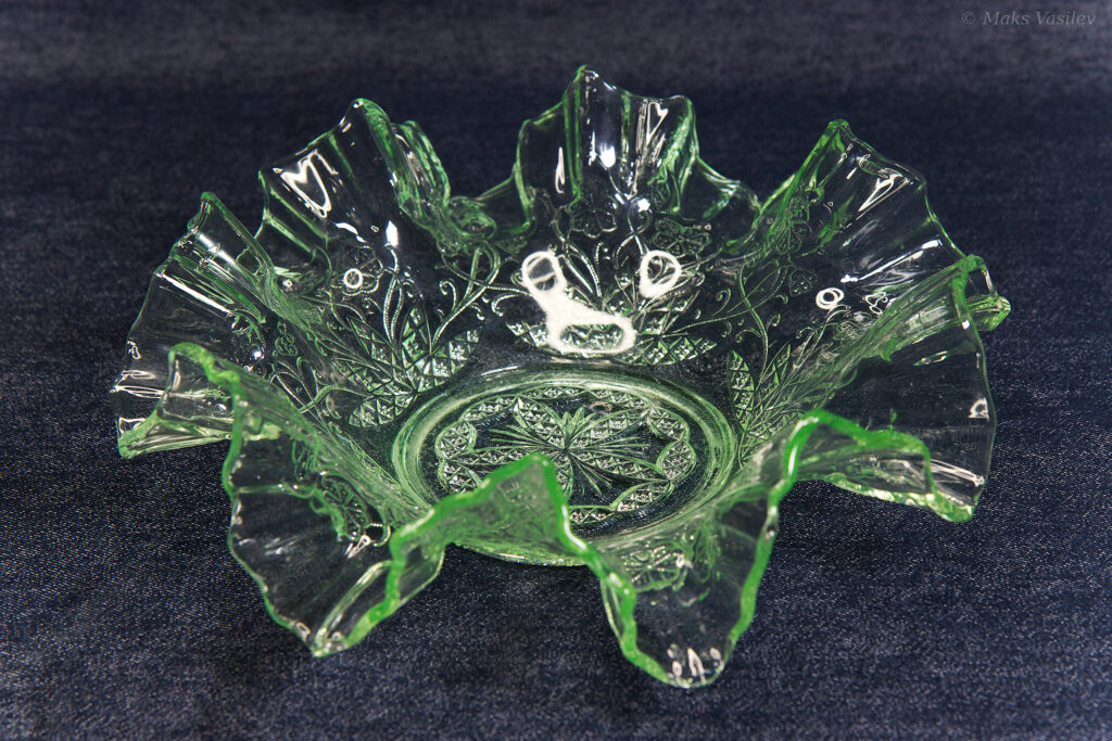 Данное блюдо периодически встречается в интернете, при чём как в урановом стекле, как в данном случае, но чаще в обычном светло-прозрачном стекле. Среди коллекционеров оно так же представлено не единичными случаями а как минимум в нескольких вариантах обычного стекла, включая прозрачное. Несмотря на это, однозначно определить производителя до сих пор невозможно, т.к. нет каталогов именно с таким рисунком. Можно лишь сделать предположения, кто из производителей мог оказаться ближе всего. Прежде всего именно в такой технике и в подобном стиле часто встречаются каталожные изделия компании Radeberg. Так же подобные вещи встречаются у компании Brockwitz Glass. Оба этих германских производителя вполне могли сотрудничать, и в целом можно сказать, что наиболее близкие родственные связи у представленного выше блюда именно с Германией.