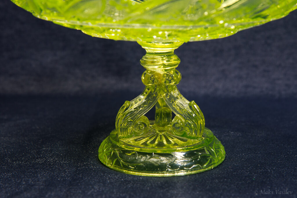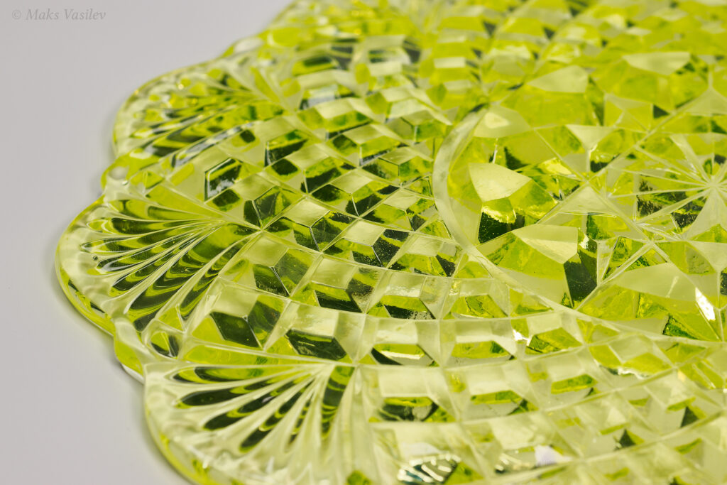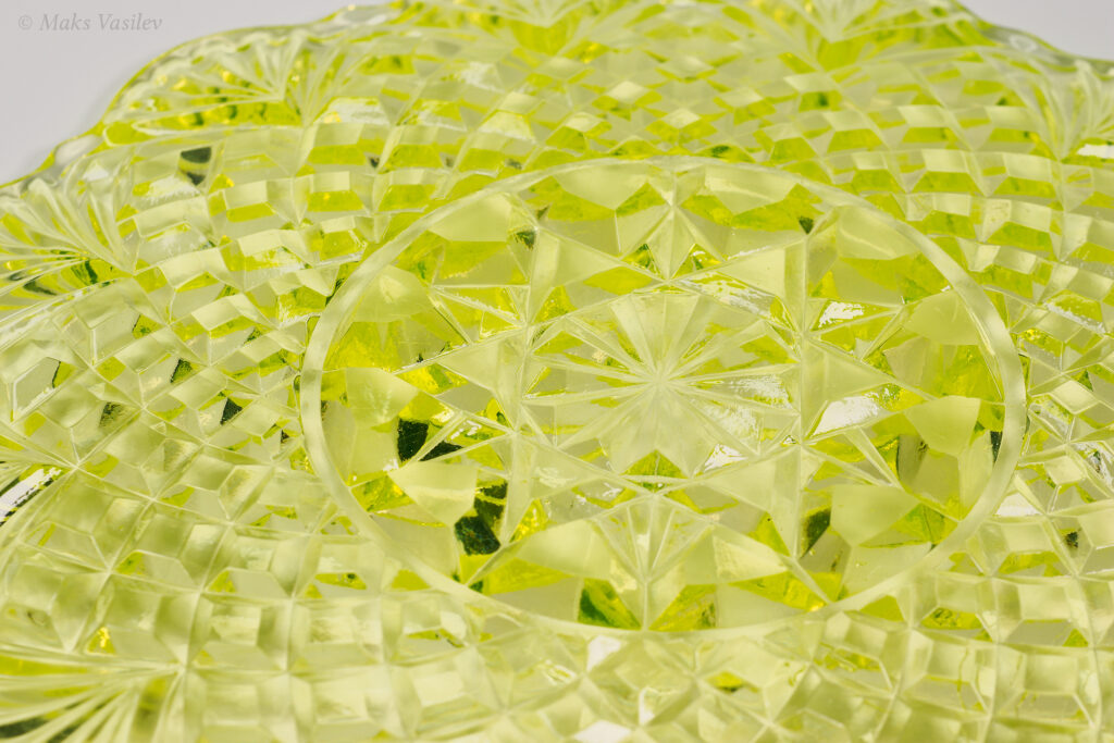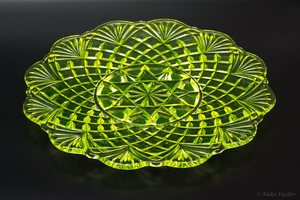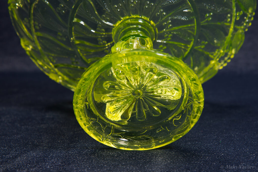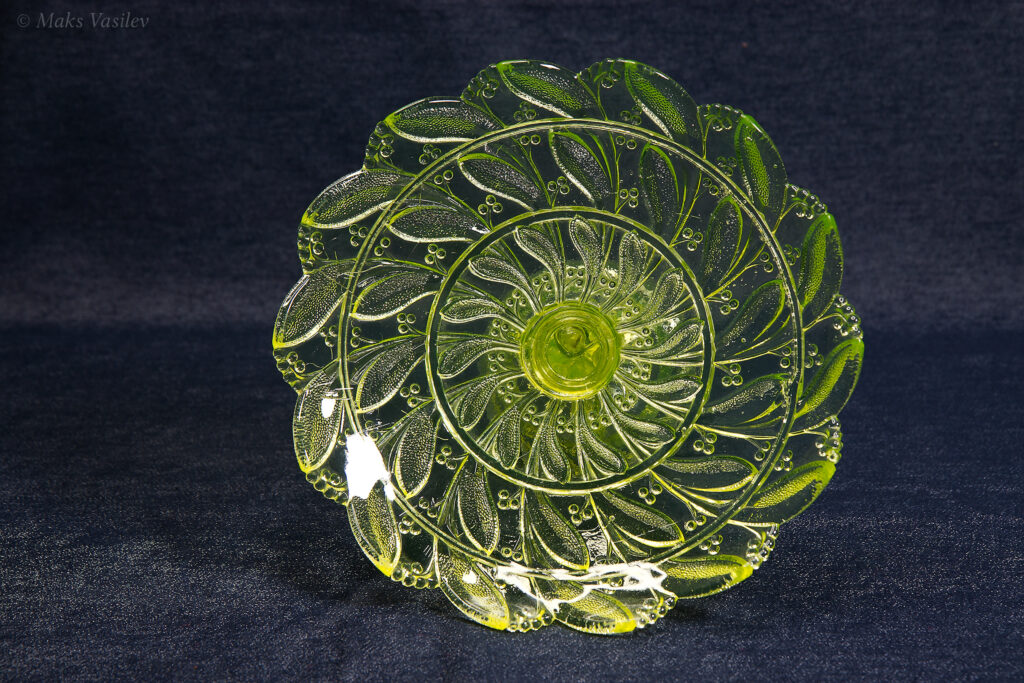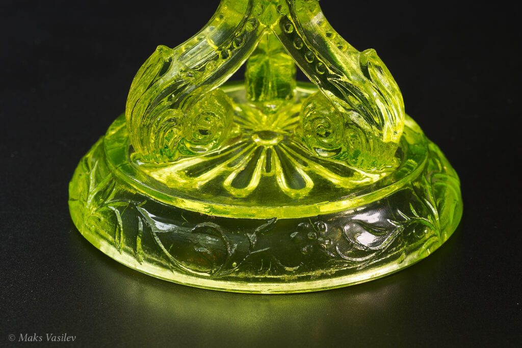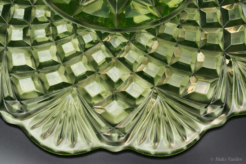 Цвет стекла на чёрном фоне хорошо показывает люминесценцию и переотражения в толще стекла. Качество граней прессованного стекла очень высокое.