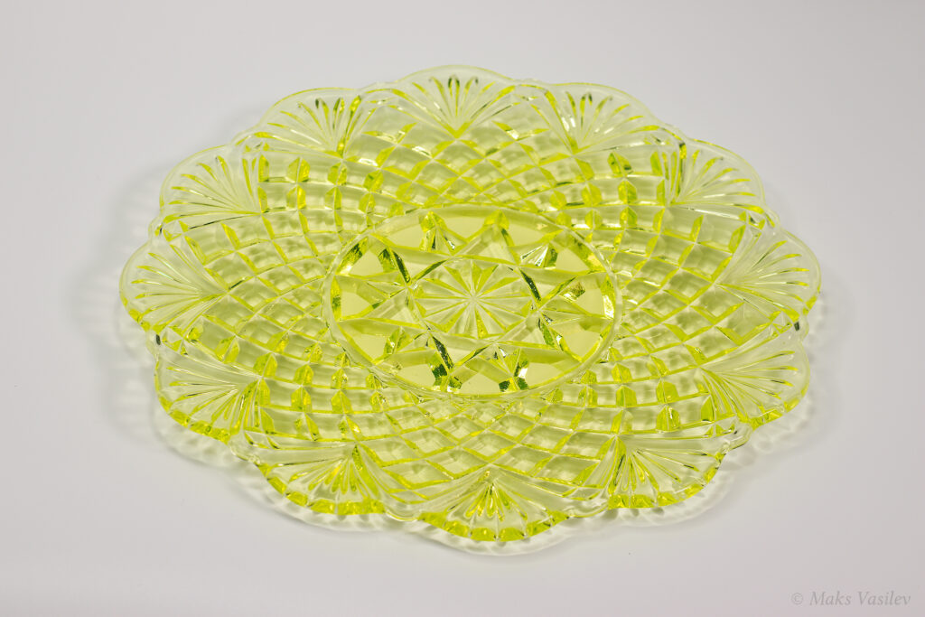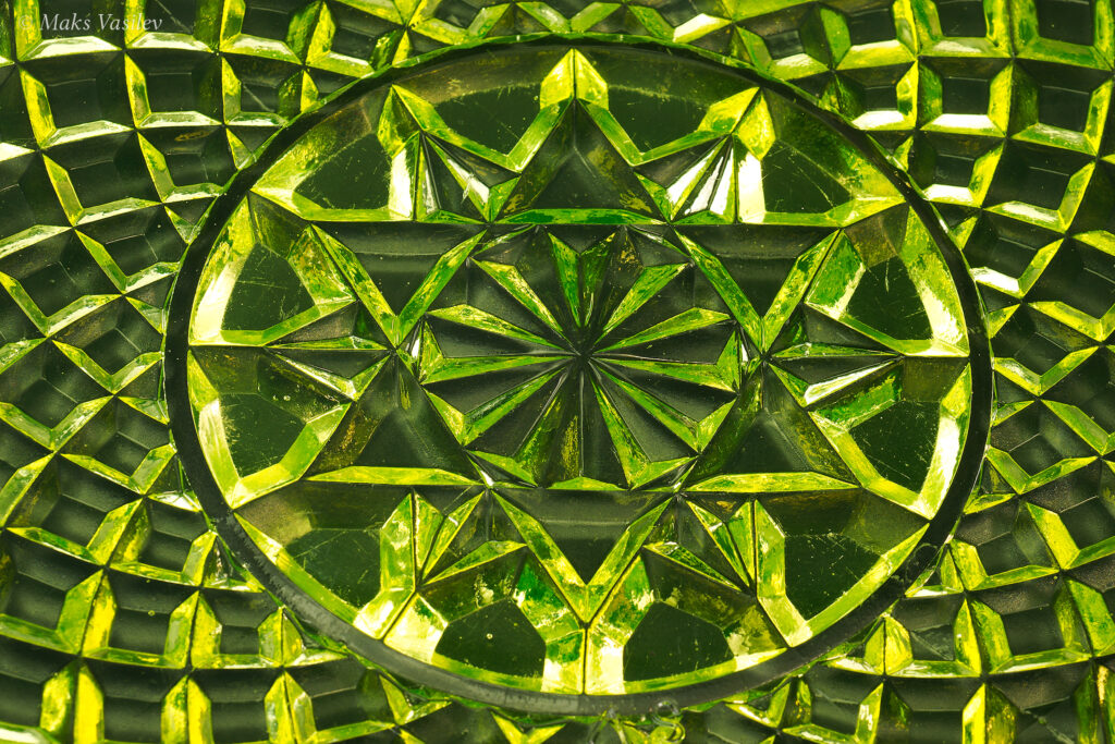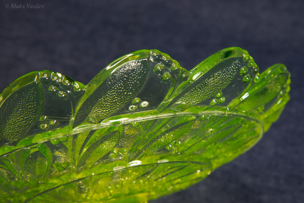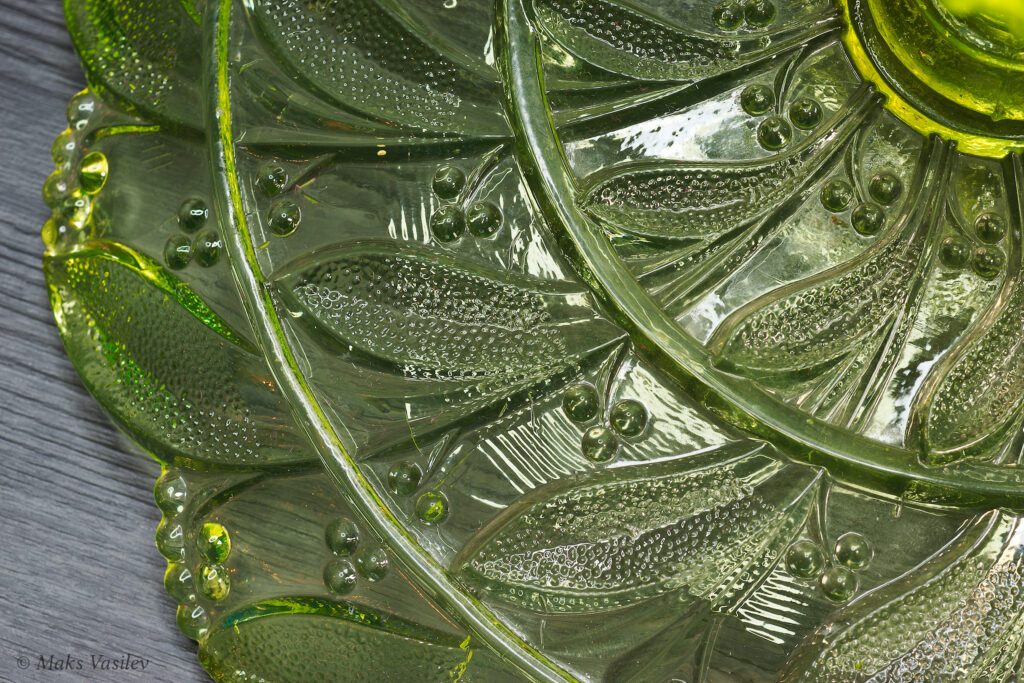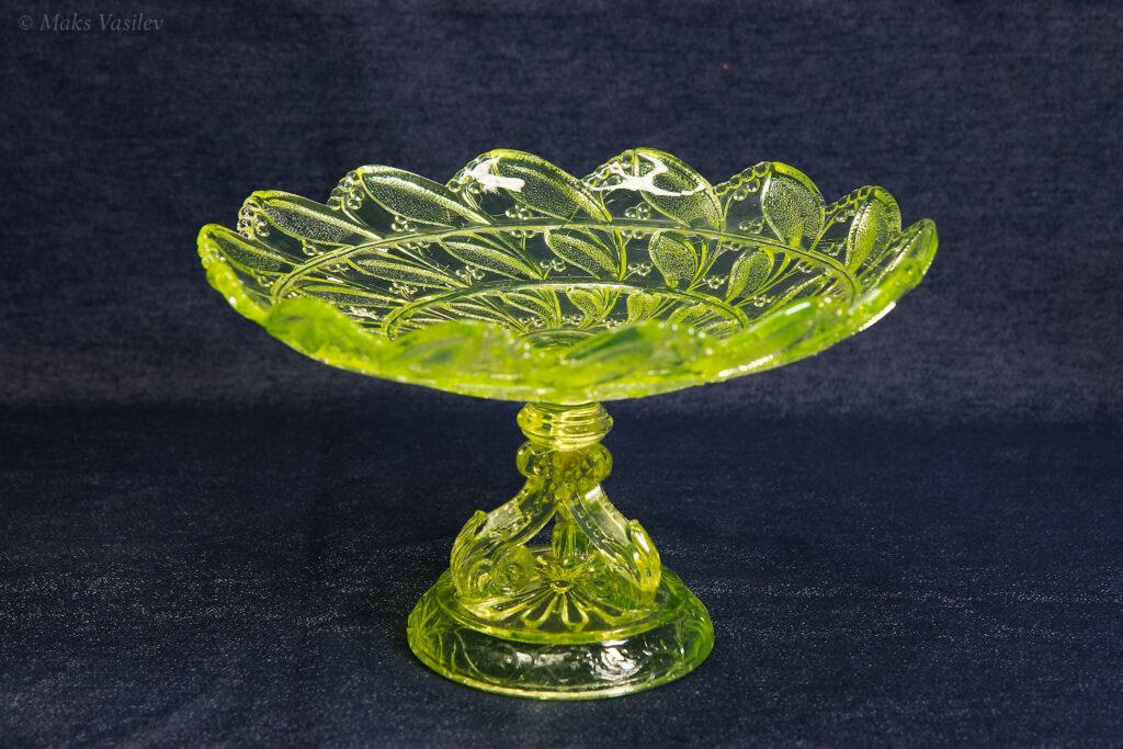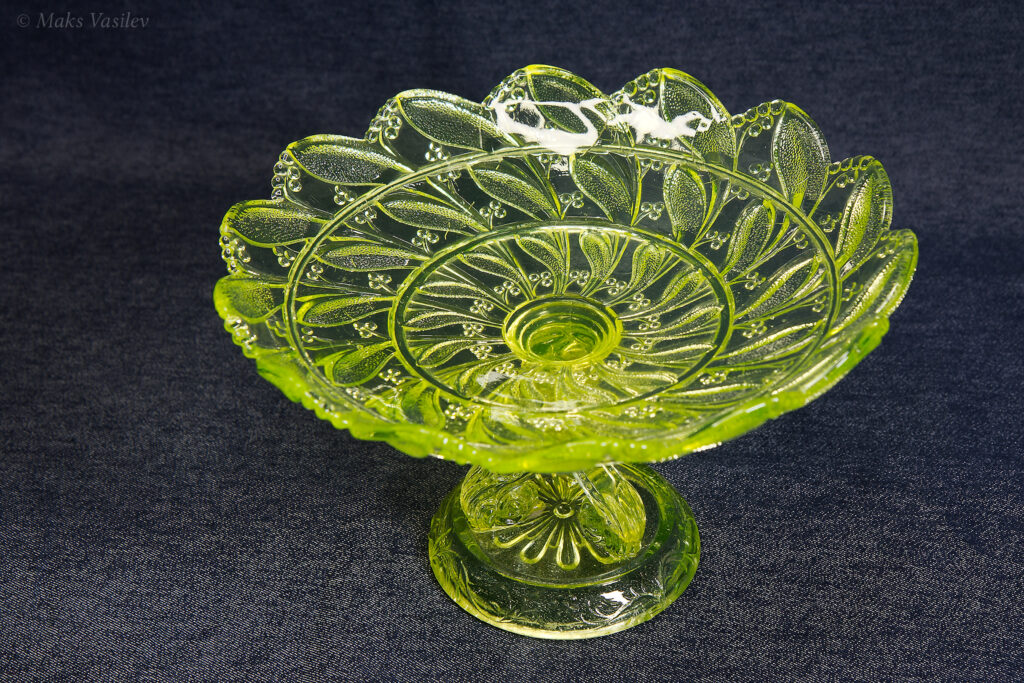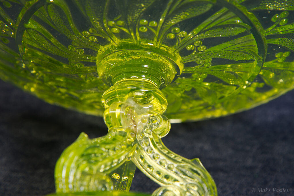 Цвет стекла на чёрном фоне хорошо показывает люминесценцию и переотражения в толще стекла. Качество граней прессованного стекла очень высокое.