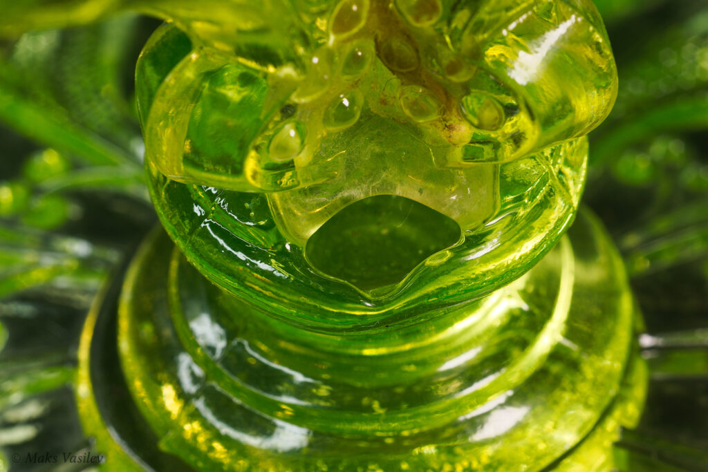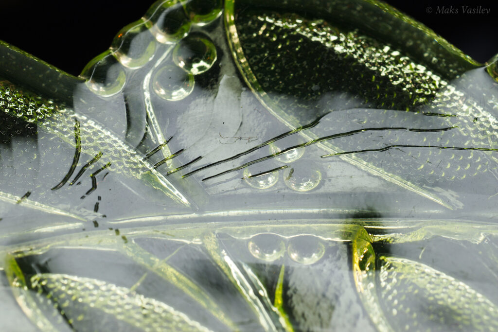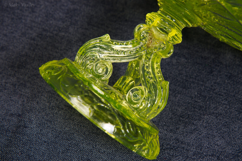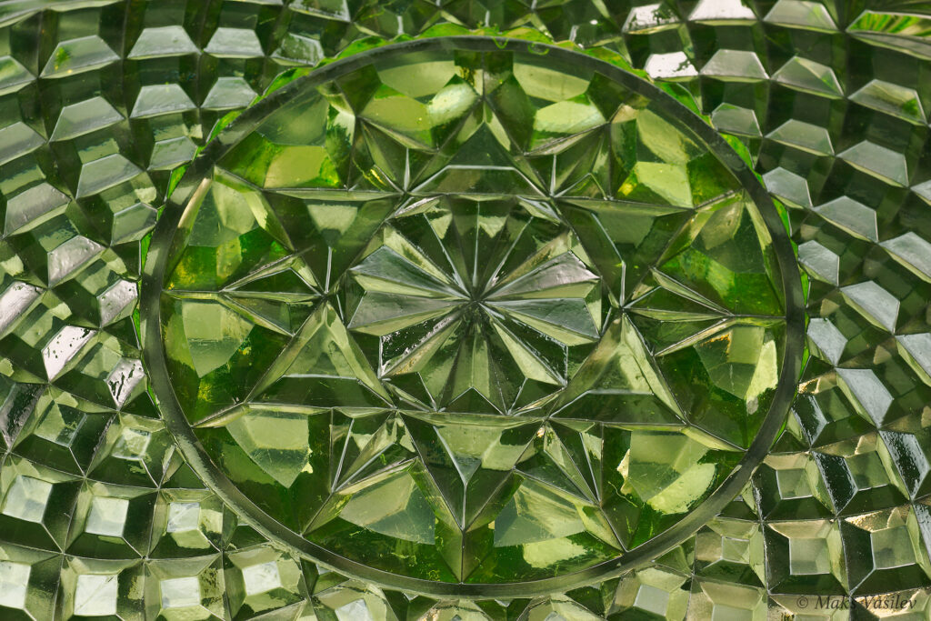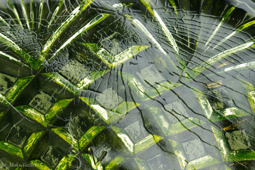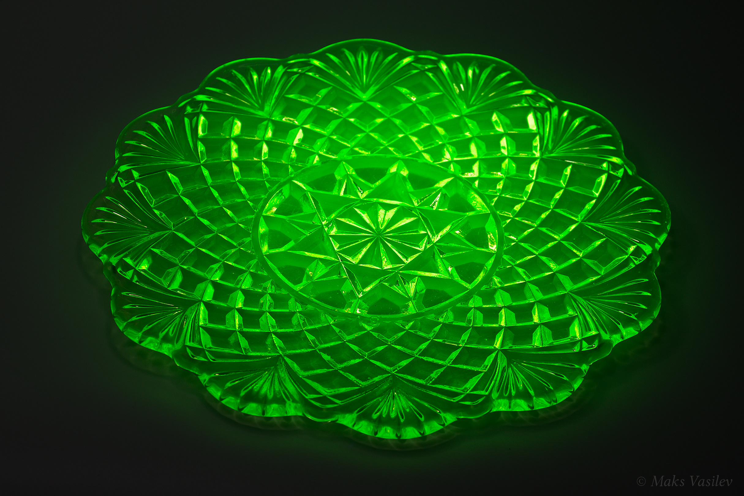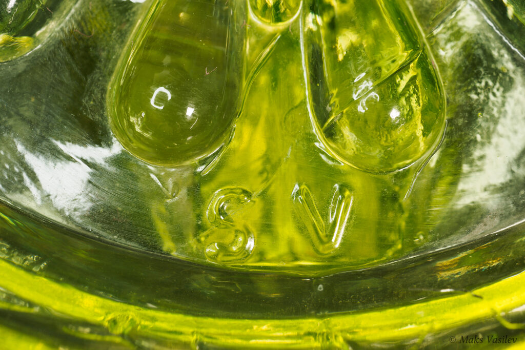 Цвет стекла на чёрном фоне хорошо показывает люминесценцию и переотражения в толще стекла. Качество граней прессованного стекла очень высокое.