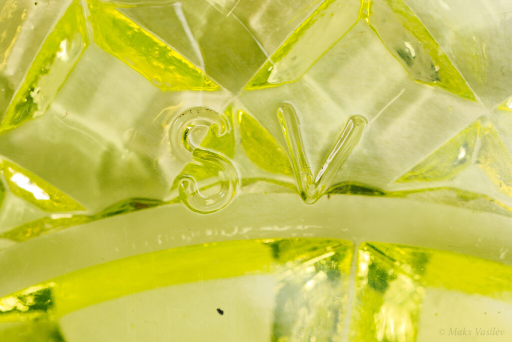 Однако данная ваза из уранового стекла имеет с нижней стороны стопы клеймо «SV», что указывает на её принадлежность к продукции Schmid Verreries.