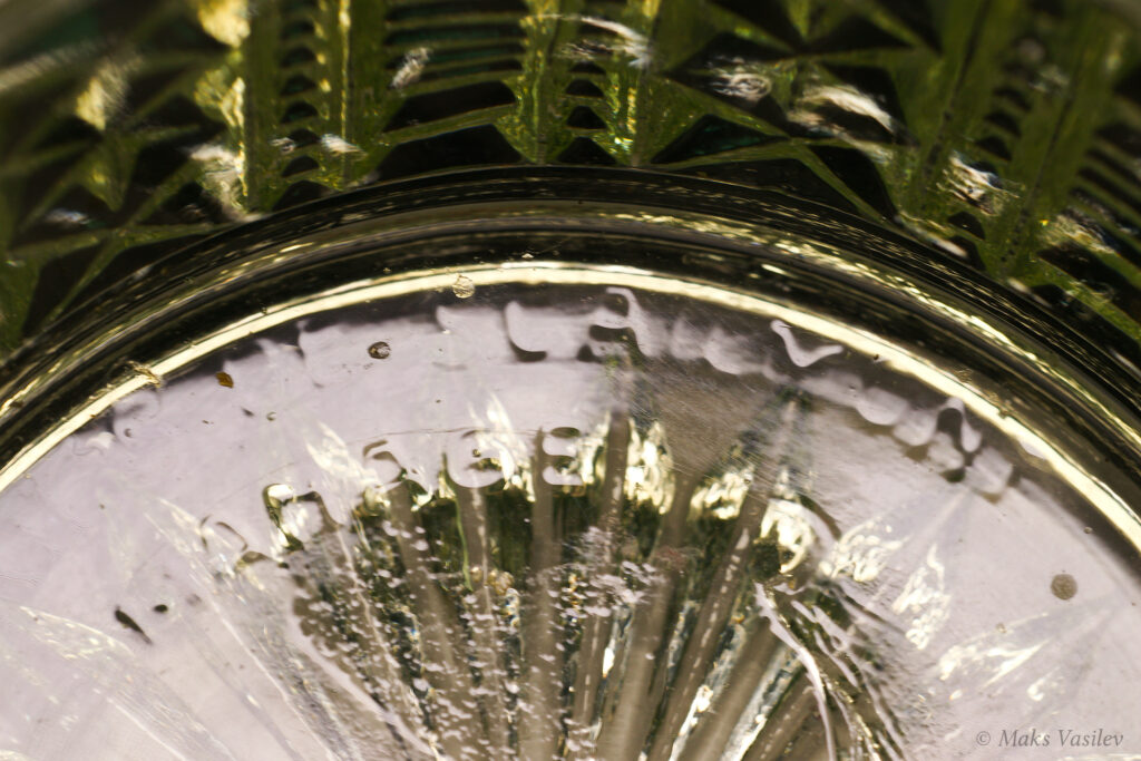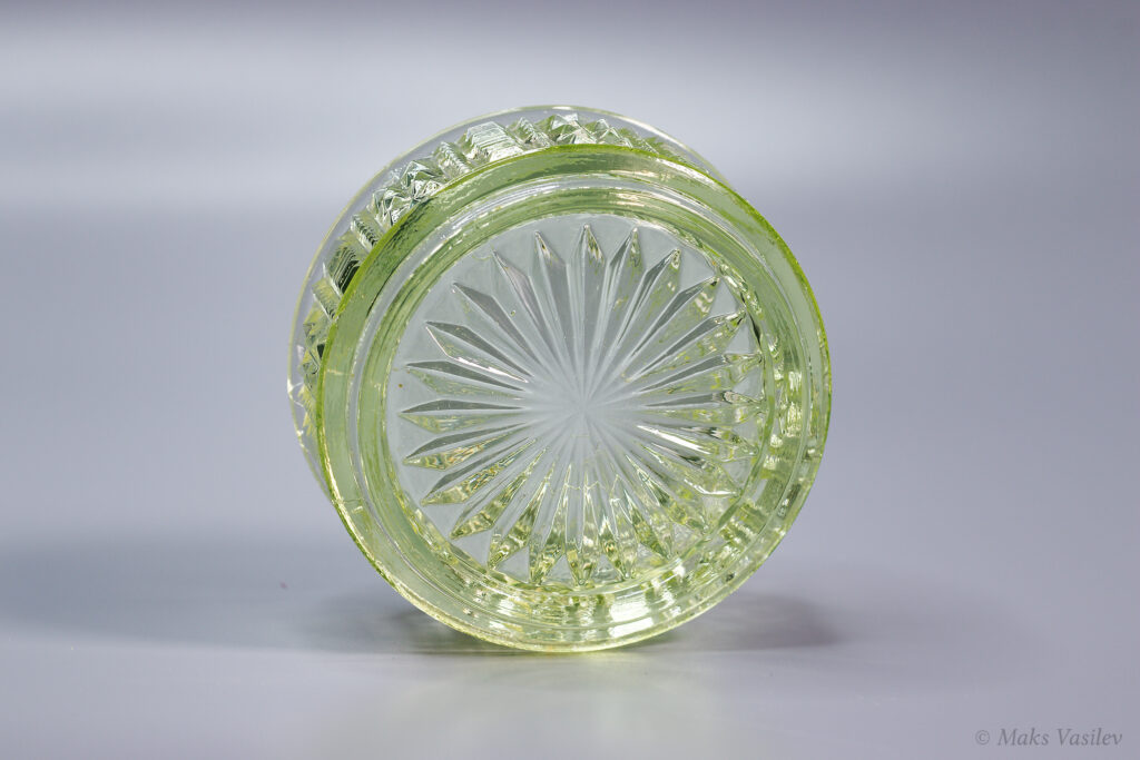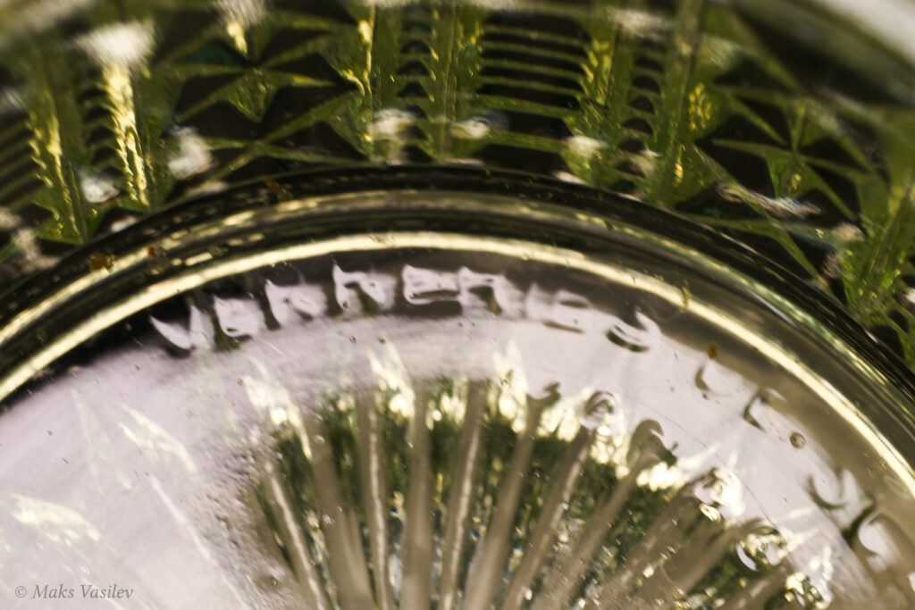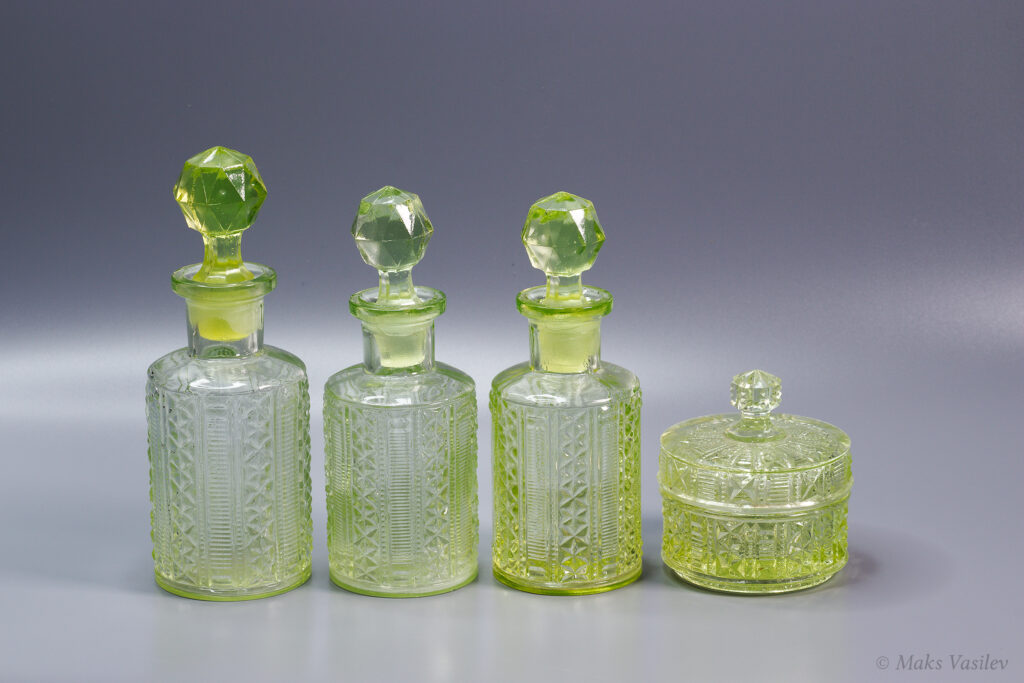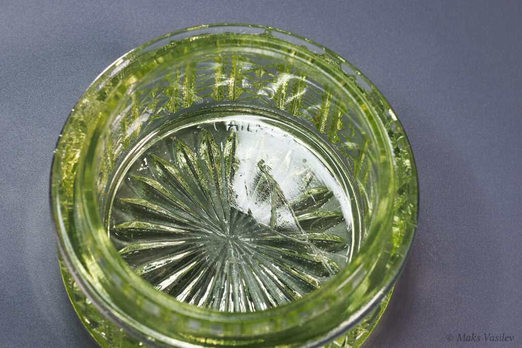 Очень распространённый и хорошо узнаваемый паттерн Verreries de Scailmont. Однако предметы с таким паттерном могли быть так же изготовлены и на фабрике Val Saint Lambert. Именно что касается флаконов достоверно и на 100% сказать, что это именно фактория Scailmont сложно, т.к. на флаконах нет клейма. А вот на шкатулке есть клеймо и по совокупности факторов, качества, состава стекла и т.д. можно сказать что флаконы с большой степенью вероятности выпущены именно на Verreries de Scailmont.