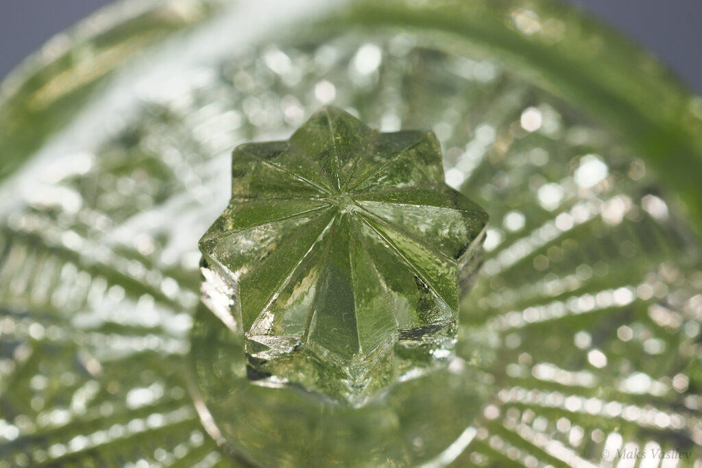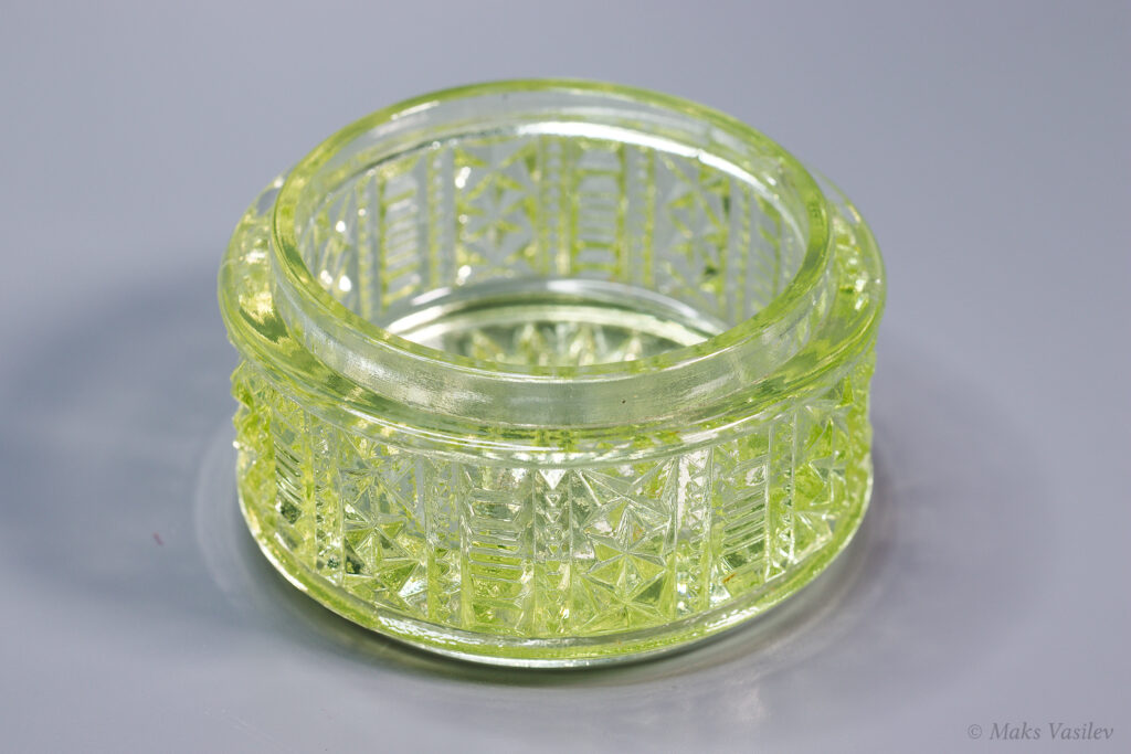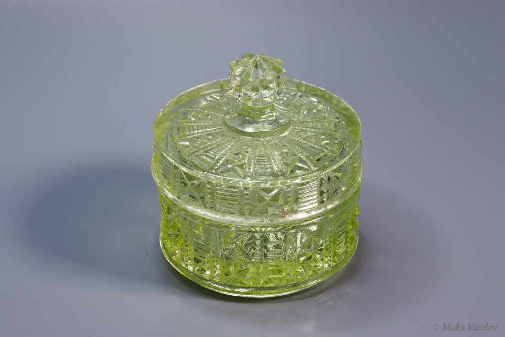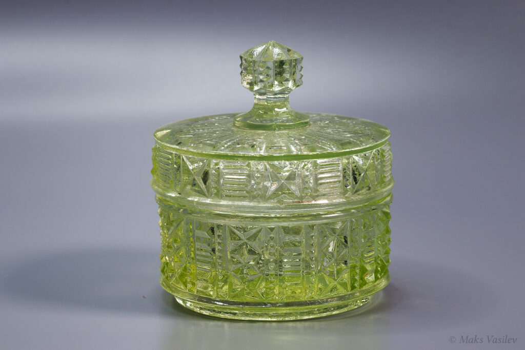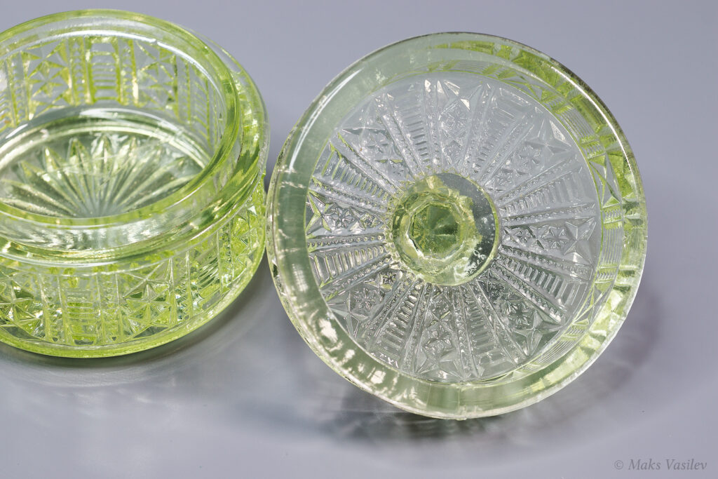 Очень распространённый и хорошо узнаваемый паттерн Verreries de Scailmont. Однако предметы с таким паттерном могли быть так же изготовлены и на фабрике Val Saint Lambert. Именно что касается флаконов достоверно и на 100% сказать, что это именно фактория Scailmont сложно, т.к. на флаконах нет клейма. А вот на шкатулке есть клеймо и по совокупности факторов, качества, состава стекла и т.д. можно сказать что флаконы с большой степенью вероятности выпущены именно на Verreries de Scailmont.