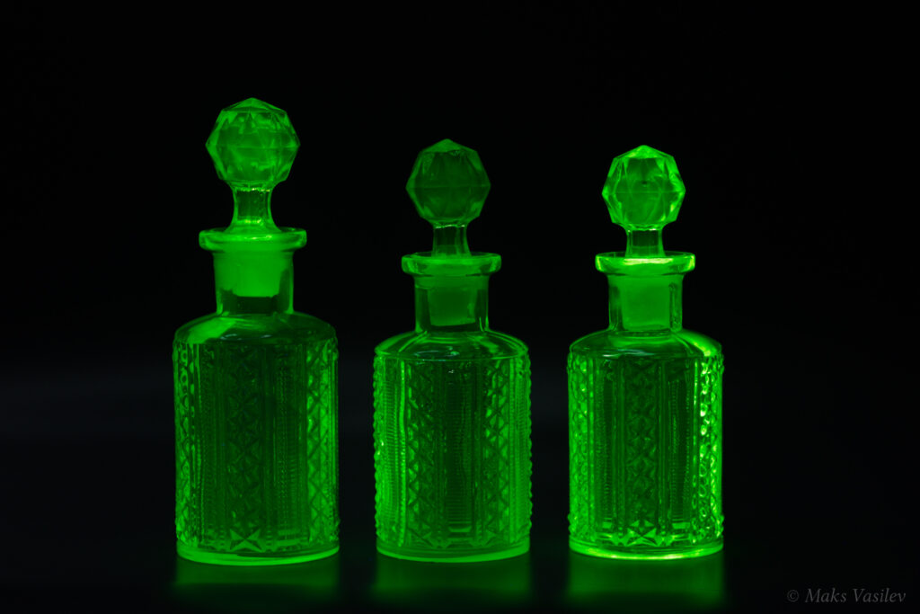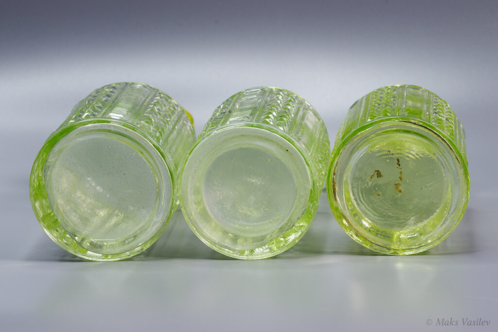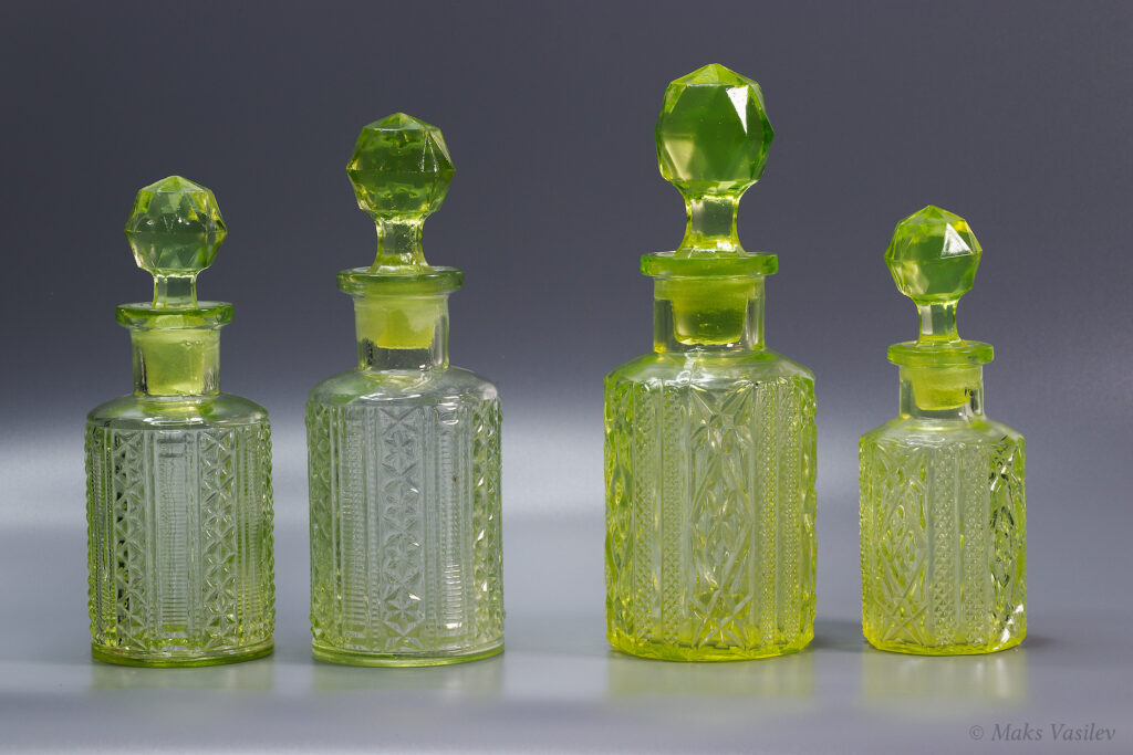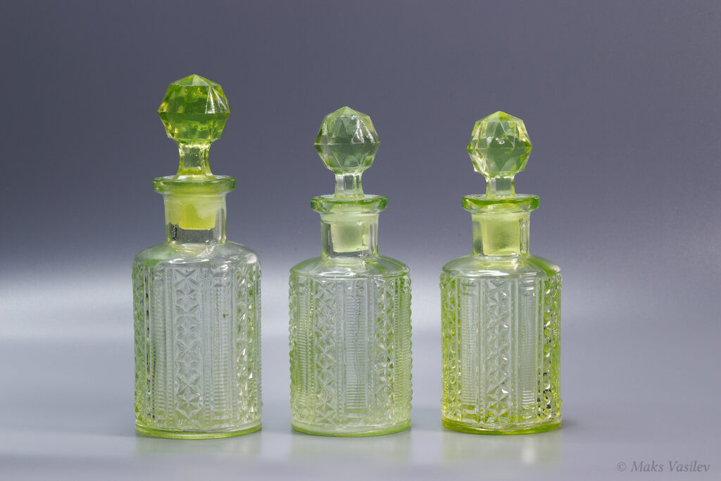 На следующем фото два дизайна, которые часто путают, это флаконы Verreries de Scailmont слева (s003/1,2) и Brockwitz Glass справа (s002/2,1). Путают не только флаконы, сам дизайн паттерна путают между производителями. Подробнее о Brockwitz Glass можно почитать здесь.