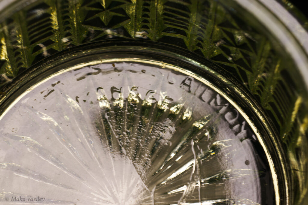 Клеймо «Verreries de Scailmont Manage». С внутренней стороны на дне шкатулки едва заметноe клеймо. Это клеймо нам гарантирует подлинность изделия.